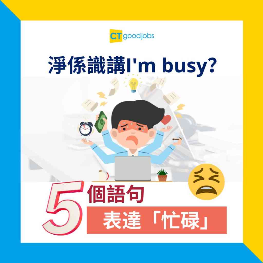 打工仔不時都遇上工作忙碌的時間,如果想用英文向上司、同事或客人交代,你又懂得怎麼表達嗎?除了「busy」,你又懂得其他同義詞或語句嗎?大家不妨學習以下5個用語,以更多元的英文表達所想,展現更地道的英語能力。