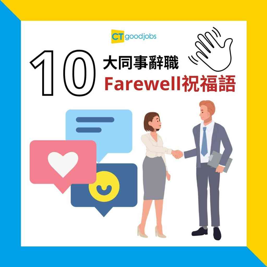 【辭職|Farewell祝福語點講好?】辭職在職場上屬正常現象,大多離職的打工仔都會準備散水餅聊表心意。而收到散水餅的你又應該如何表達祝福呢?正所謂:「山水有相逢。」即使同事辭職了,他日亦可能會在某處再相見。在告別(Farewell)時,打工仔不妨參考下列10句句子,向離職的同事表達感謝和祝福。同場,CTgoodjobs更會推薦5大辭職信禮貌字句,讓大家與僱主/老闆保持良好關係。
