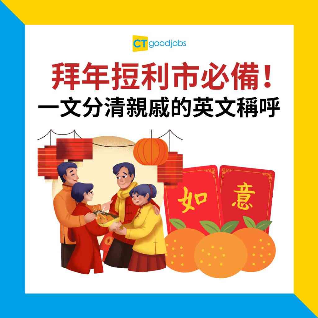 在英文中,稱呼親戚比中文簡單得多,通常用「Aunt」及「Uncle」就可以。但相反,中文就要搞清親屬關係了。希望以上資訊能夠幫助大家在新年期間順利度過,成功𢭃利市!